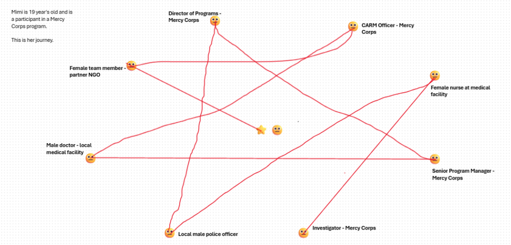 - we asked one participant to visually map interactions between a survivor, community members, staff, and others as the case study was read aloud